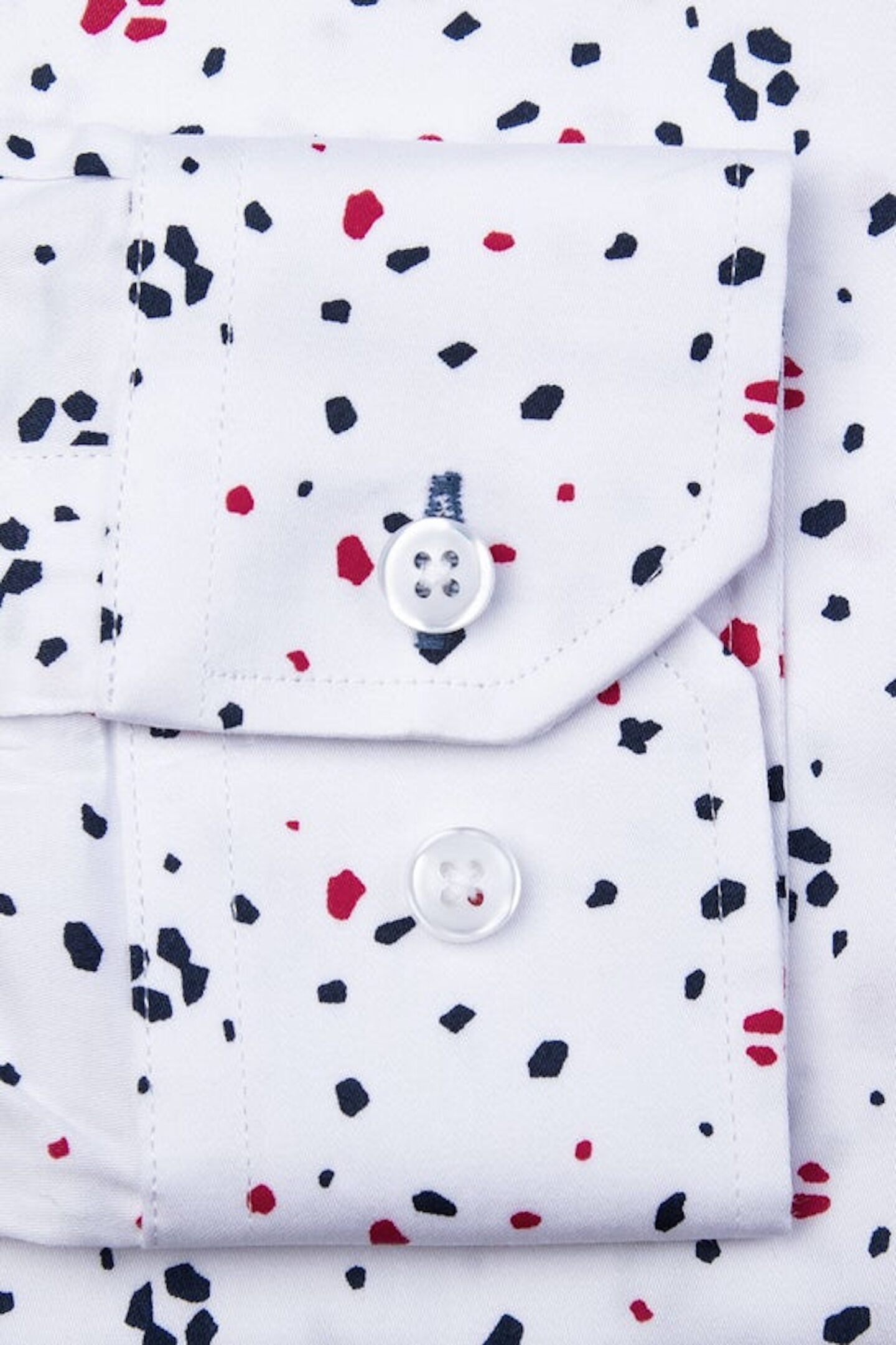Whether your customer prefers their shirt tucked or untucked, we’ve got them (literally) covered with our untuckable dress shirts. These expertly crafted beauties also feature adjustable notch cuffs, a reinforced side seam accent, and a spread collar that looks perfect with or without a necktie. Bottom line? They’re going to need more closet space. This White Untuckable Classic Fit Dress Shirt with Navy and red specks by Alynn is a perfect addition to your stores offering.