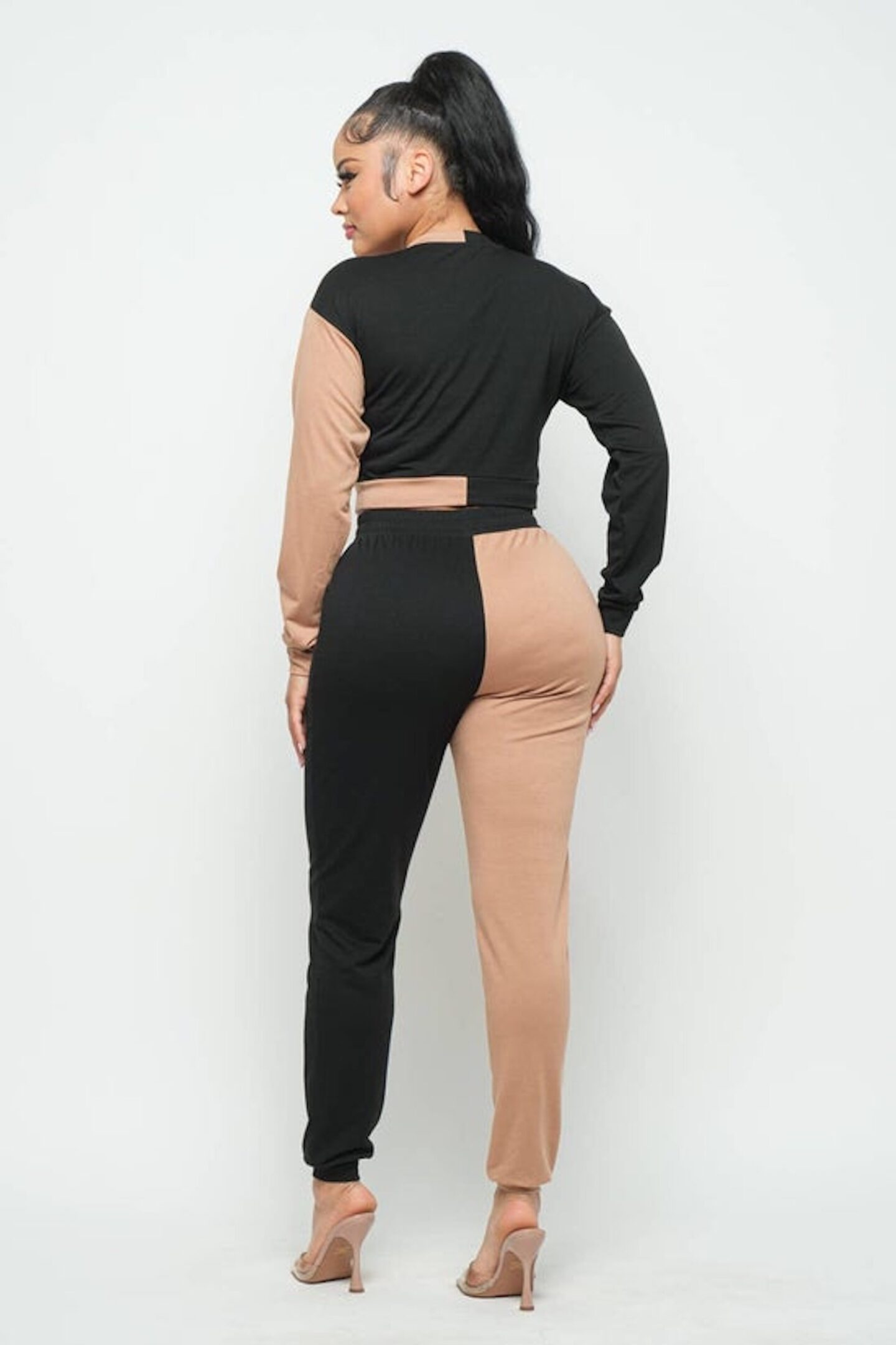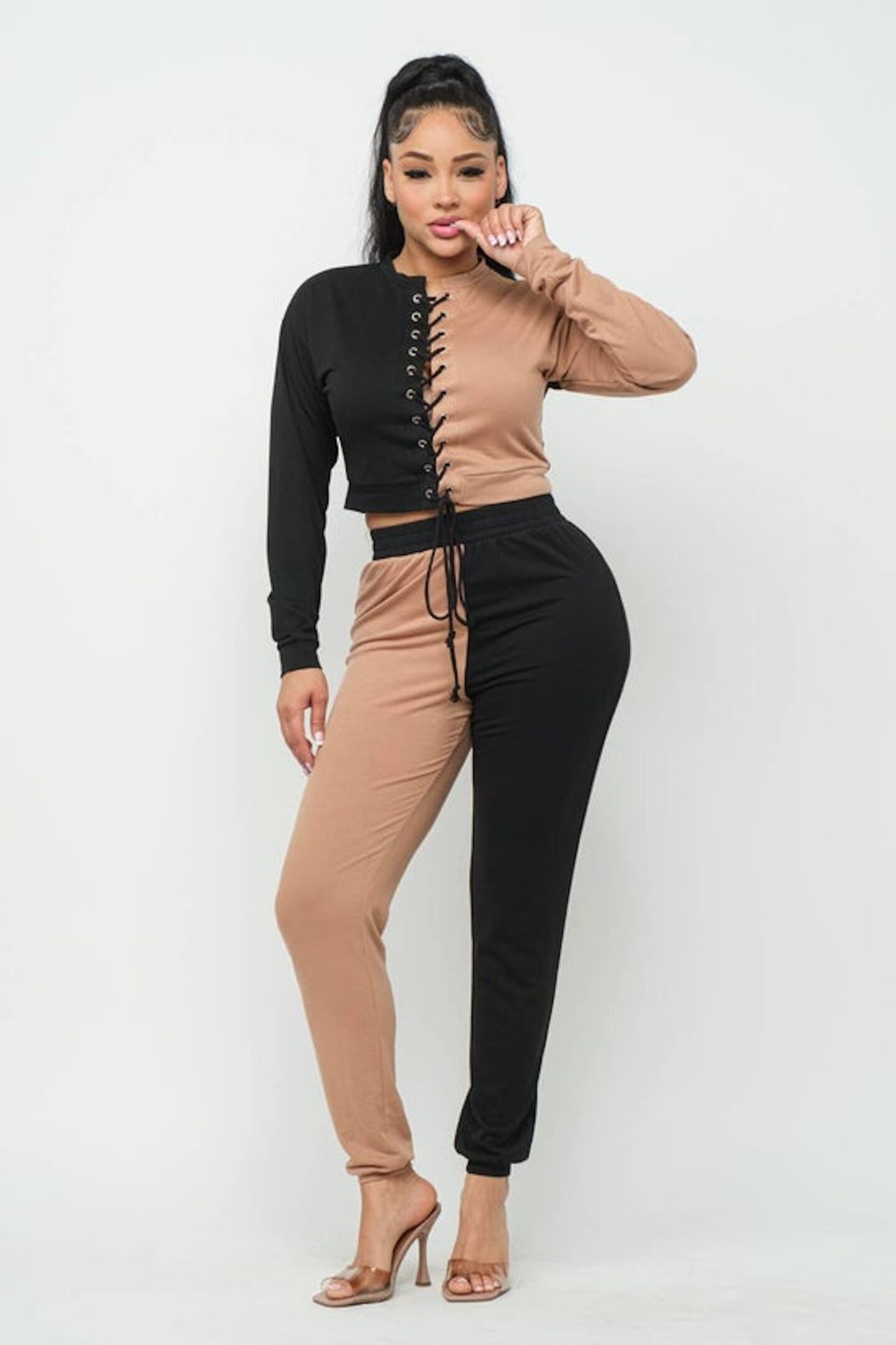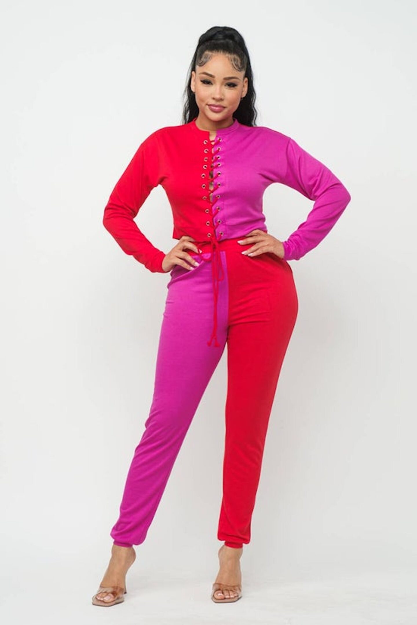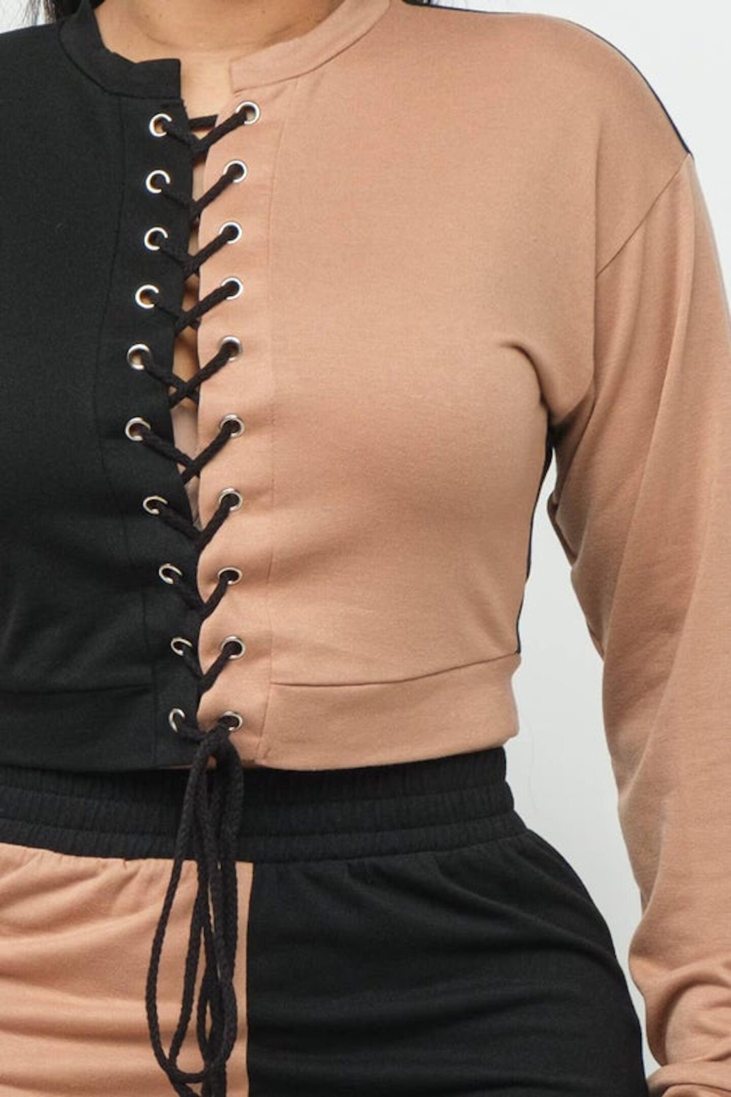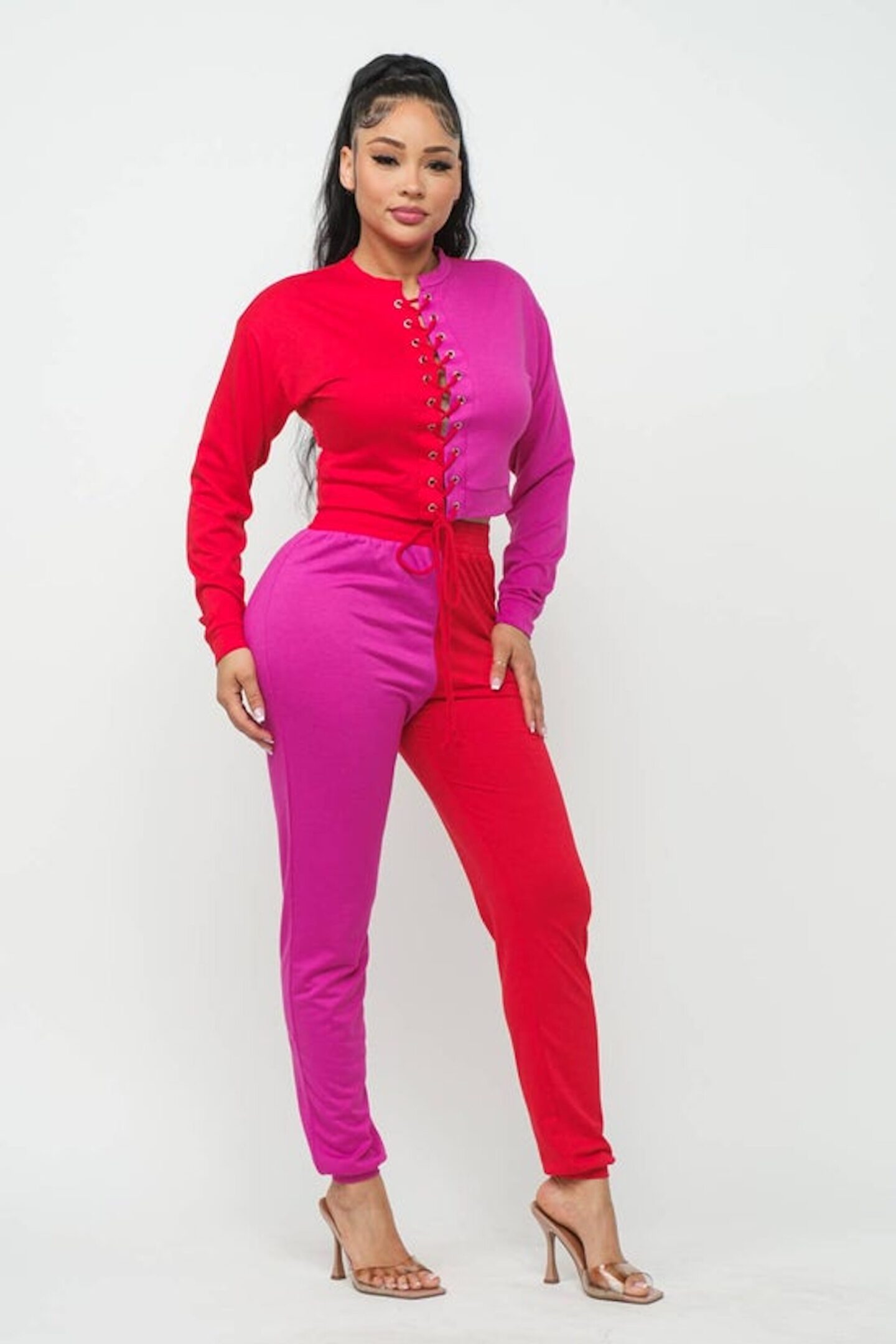 French Terry Fabric Round Neck Color Block Front Eyelet Cross Tie Long Sleeve Top And Color Block Elastic Waistband Pants Set