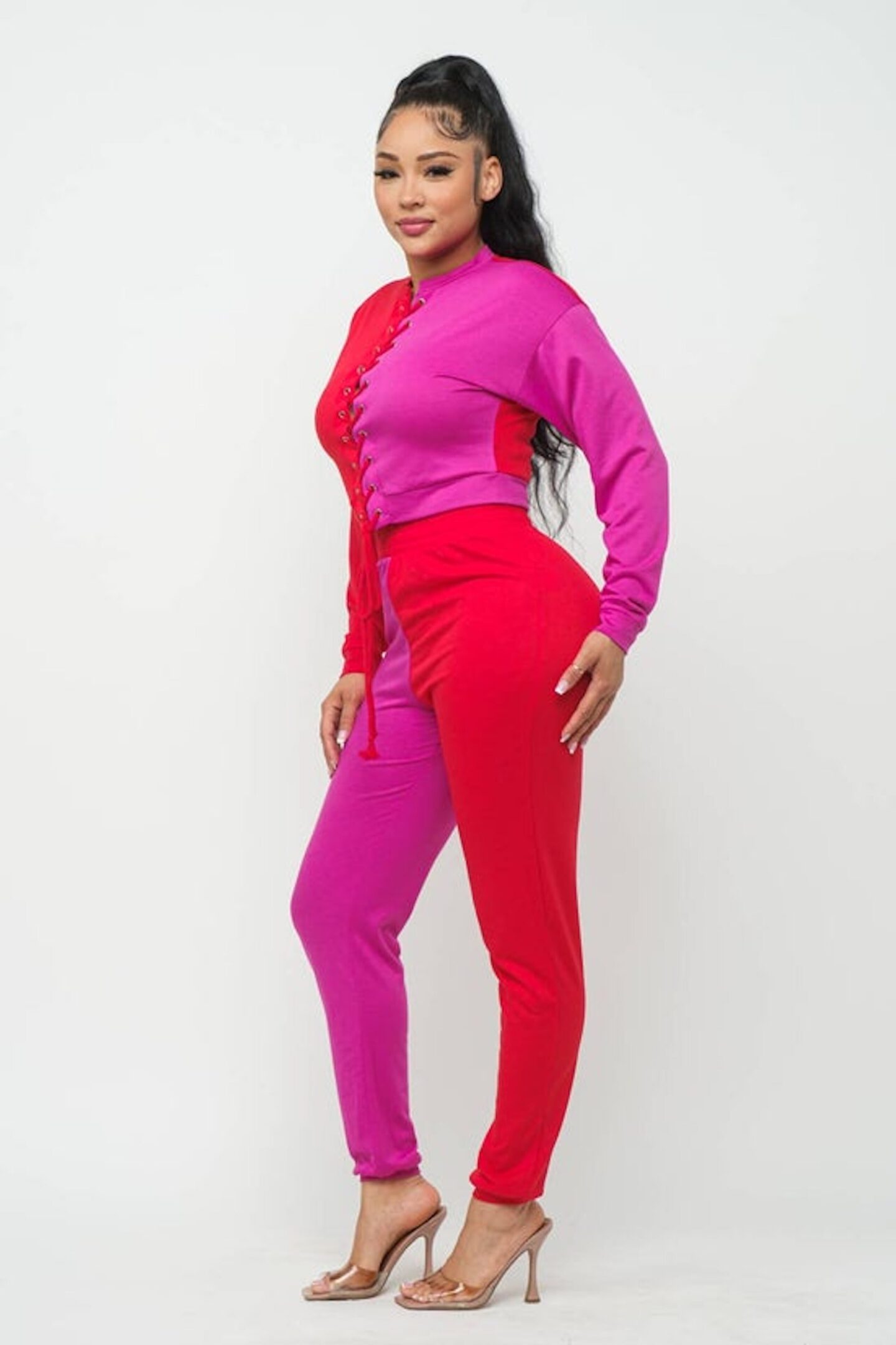French Terry Fabric Round Neck Color Block Front Eyelet Cross Tie Long Sleeve Top And Color Block Elastic Waistband Pants Set