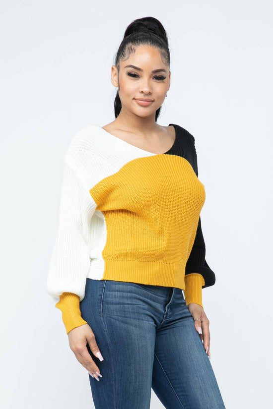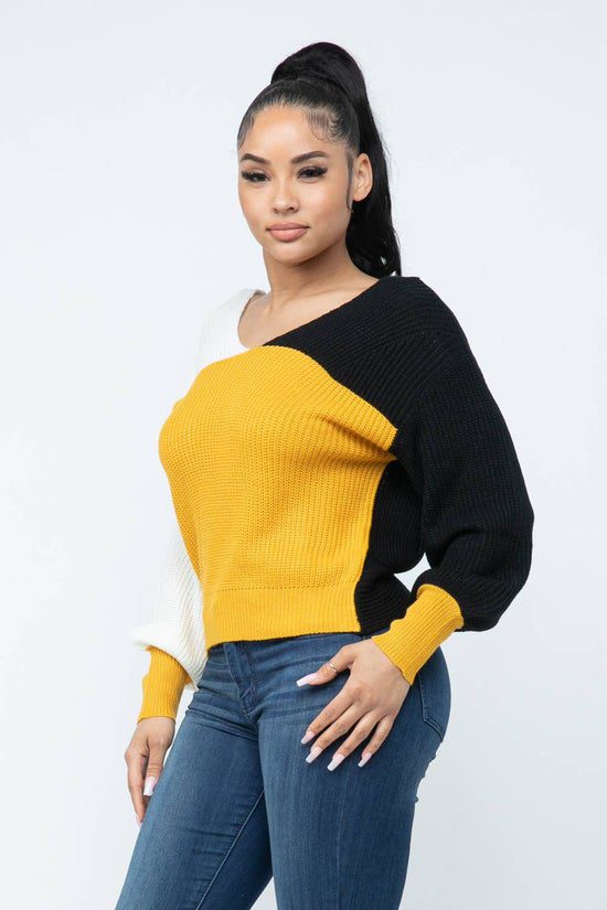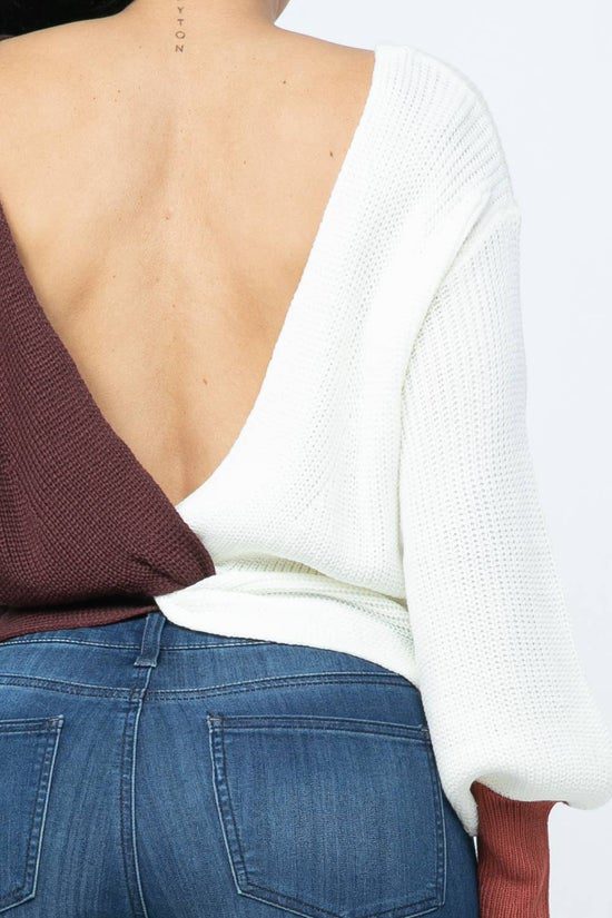 Color Block Twisted Open Back Loose Fit Cozy Sweater
