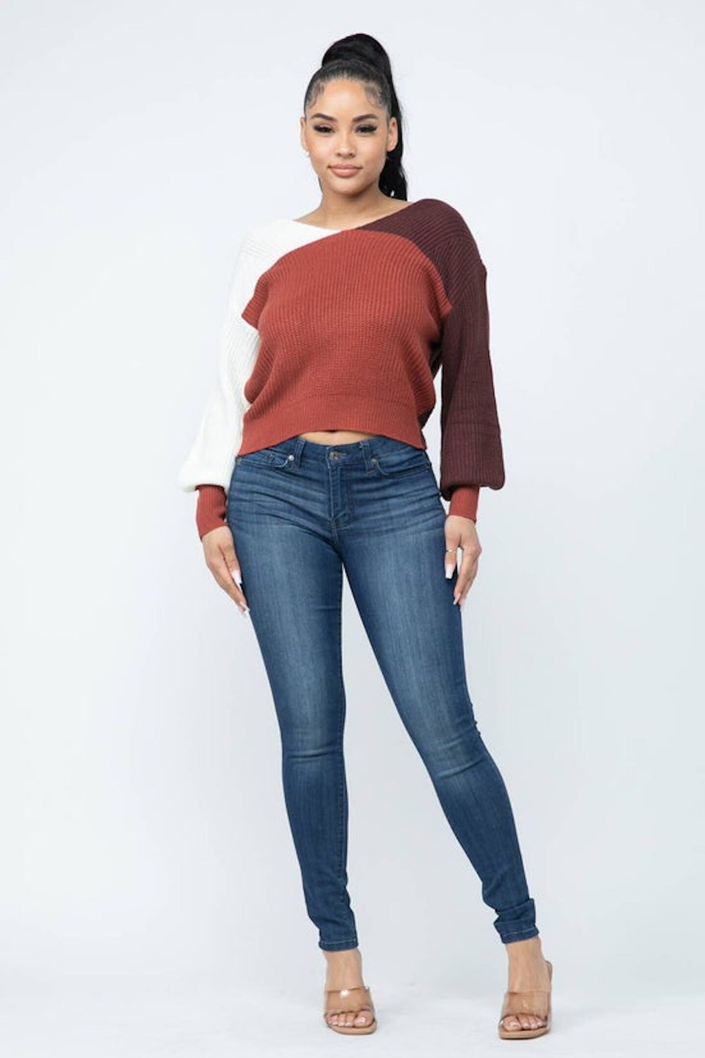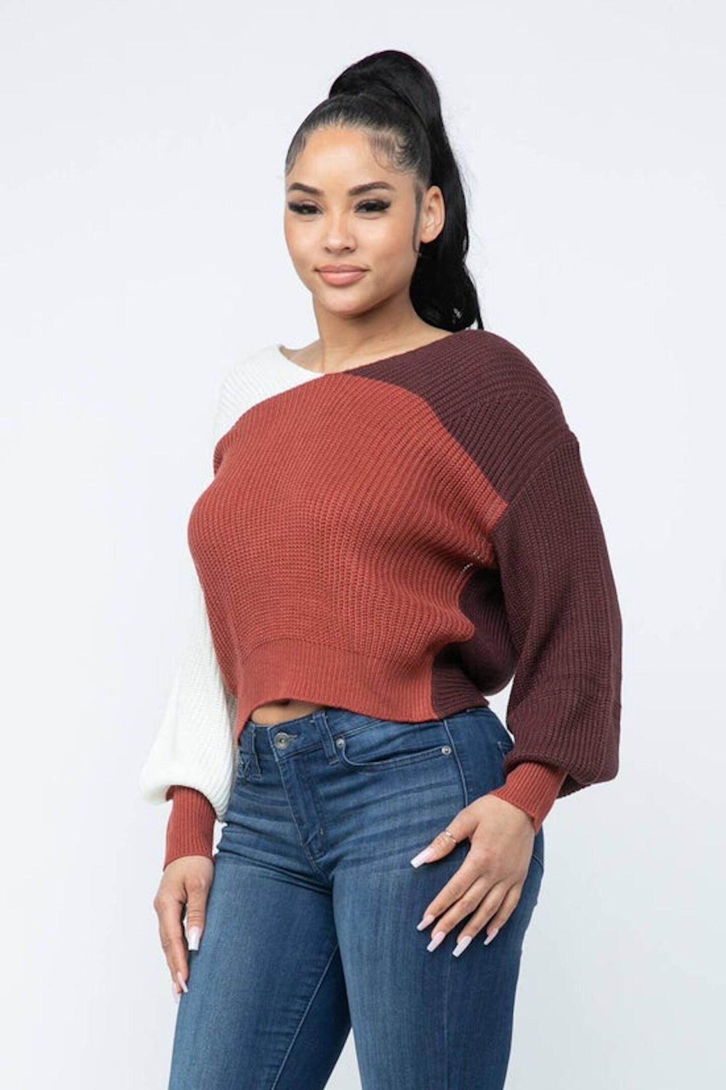 Color Block Twisted Open Back Detail Loose Fit Cozy Sweater