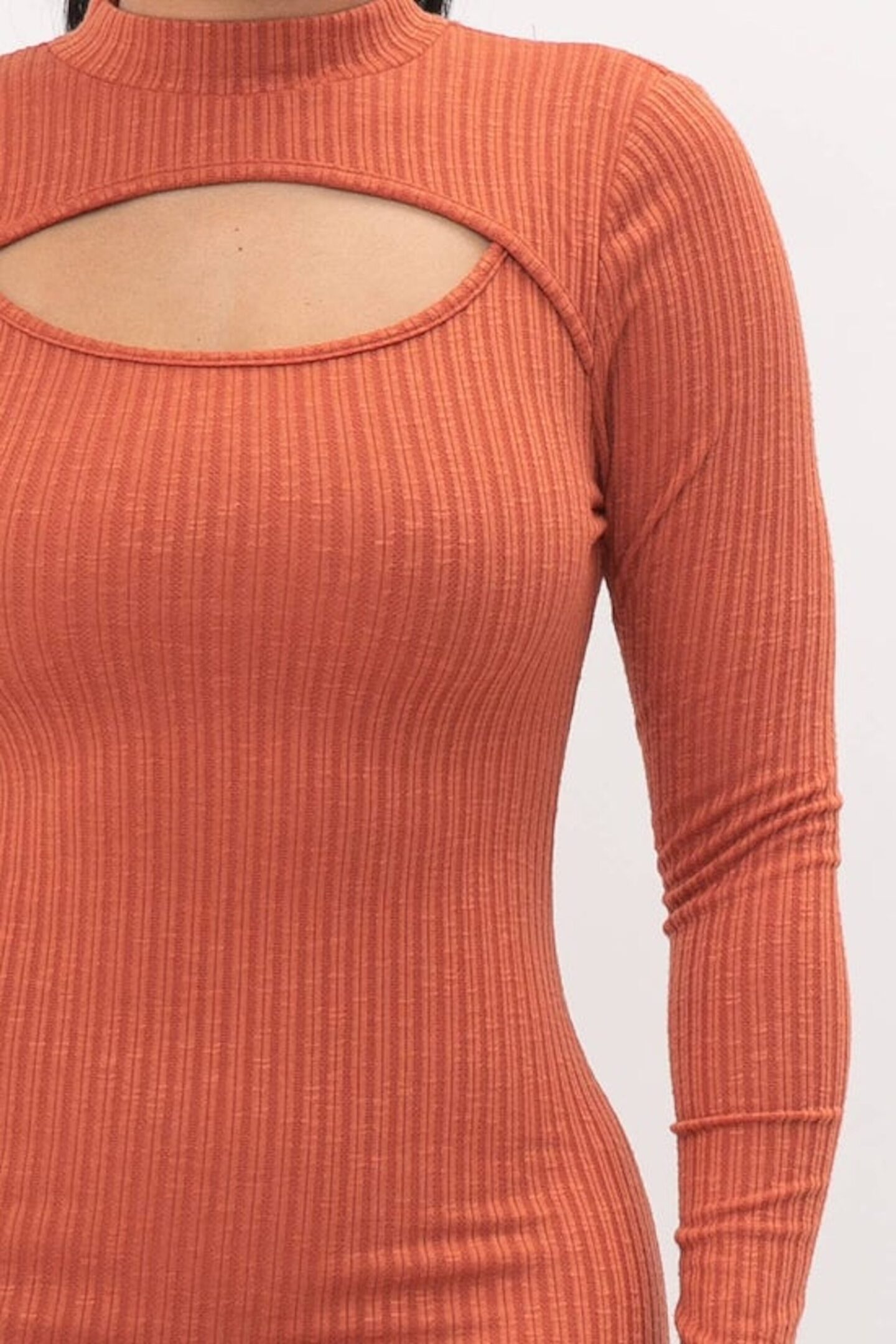 Knit Sweater Rib Front Cut Out Pullover Style Mock Neck Long Sleeve Midi Dress