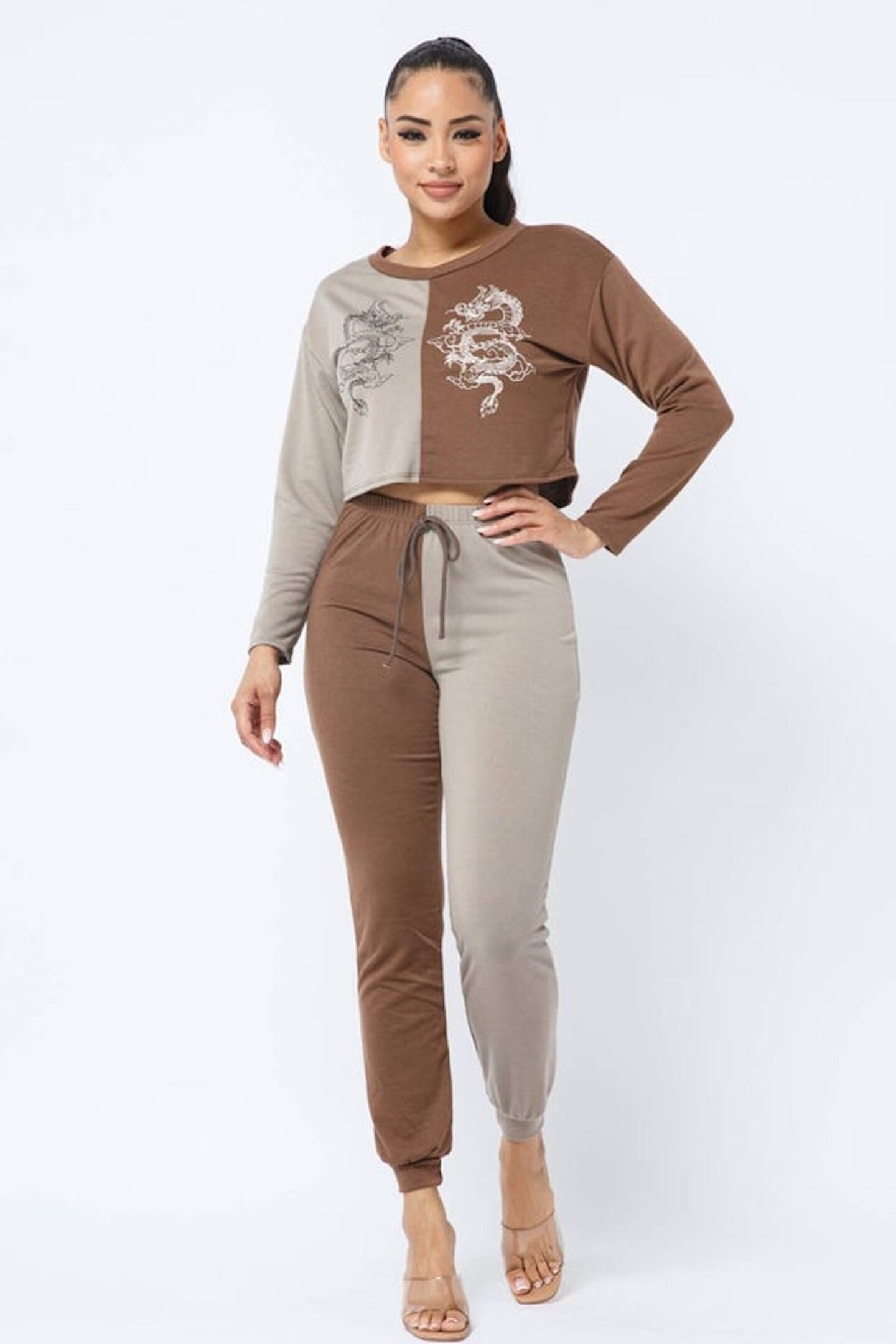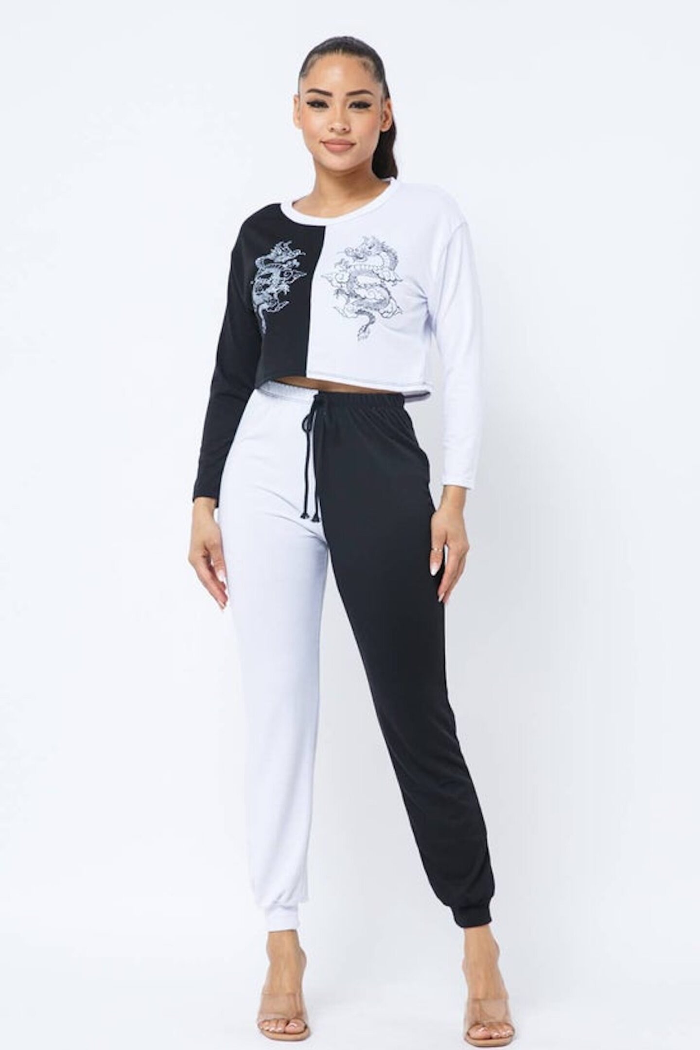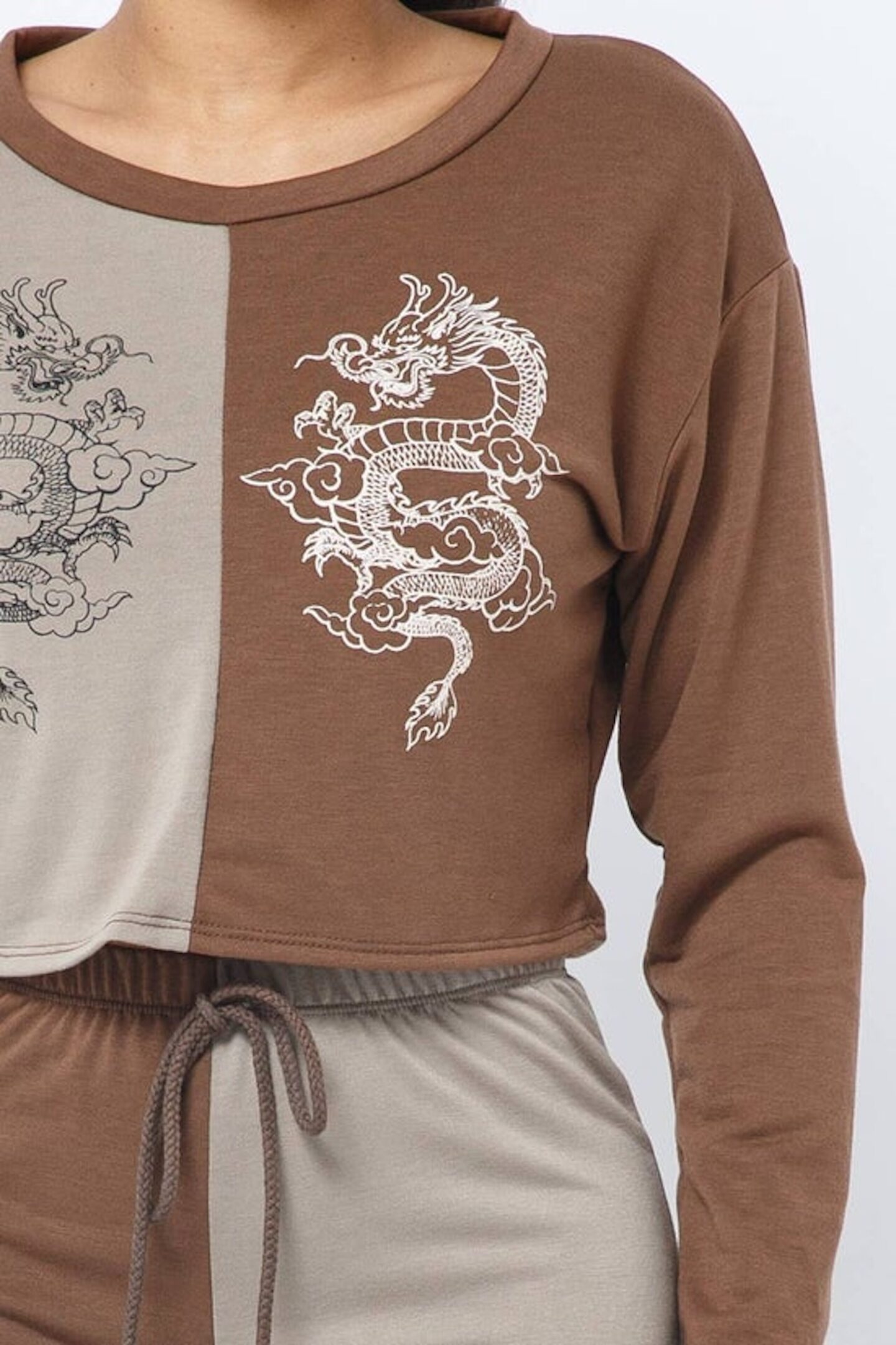 French Terry Half and Half Sliced Color Block Front Dragon Screen Long Sleeve Top and Drawstring Jogger Pants Set