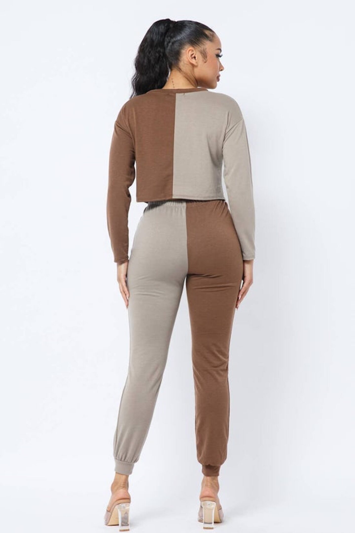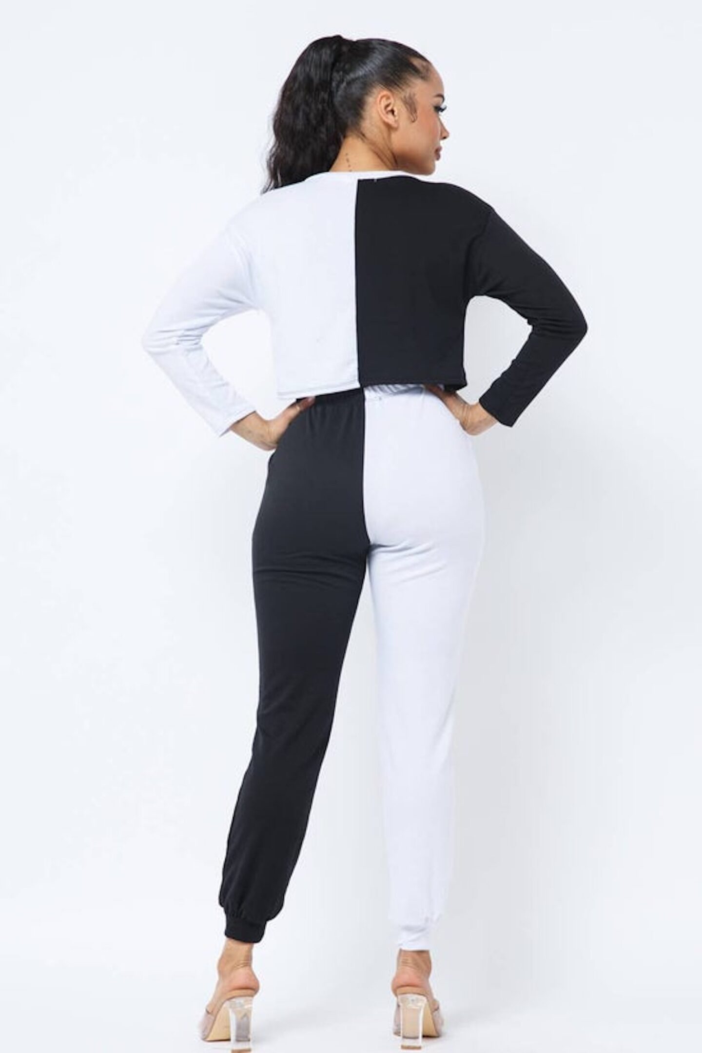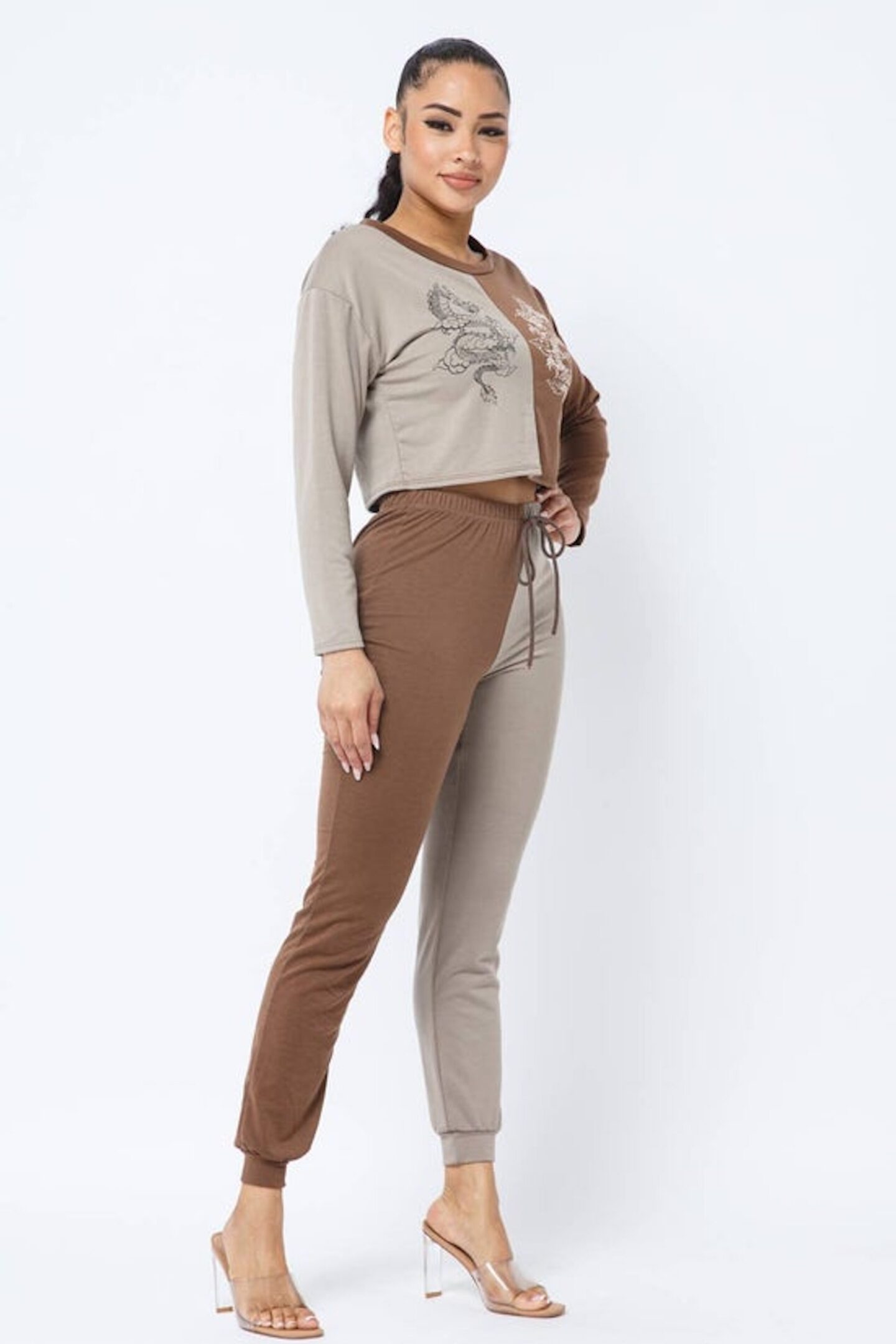 French Terry Half and Half Sliced Color Block Front Dragon Screen Long Sleeve Top and Drawstring Jogger Pants Set