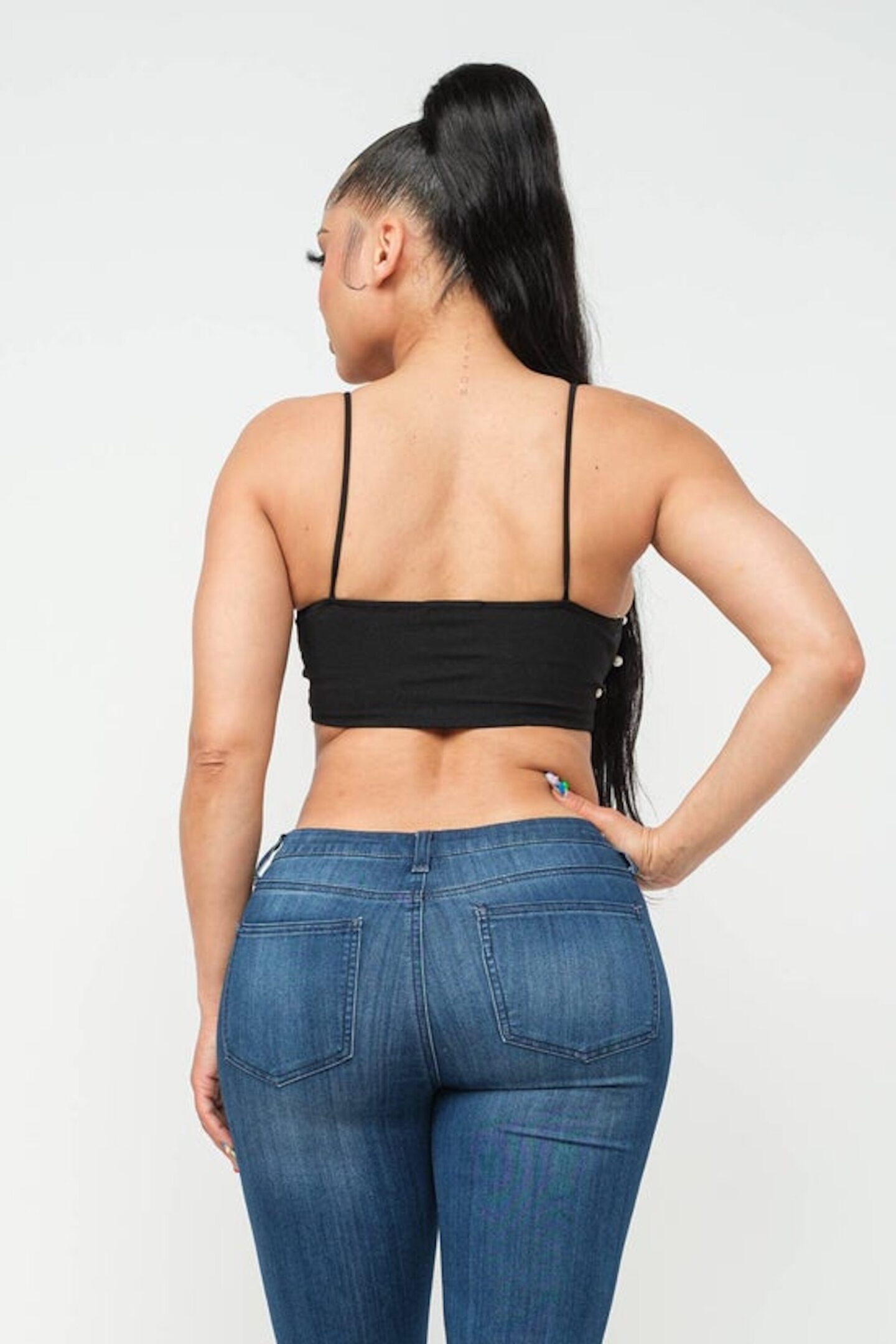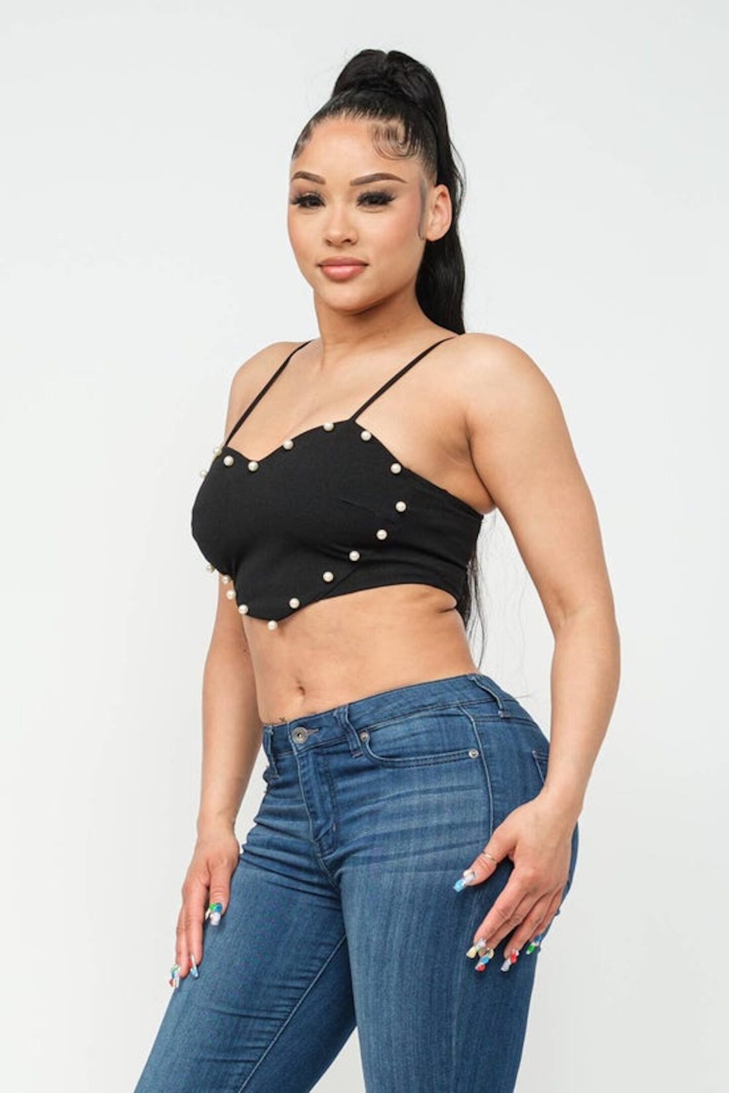 Techno Crepe Front Heart Pearl Beaded Detail Spaghetti Strap Crop Top