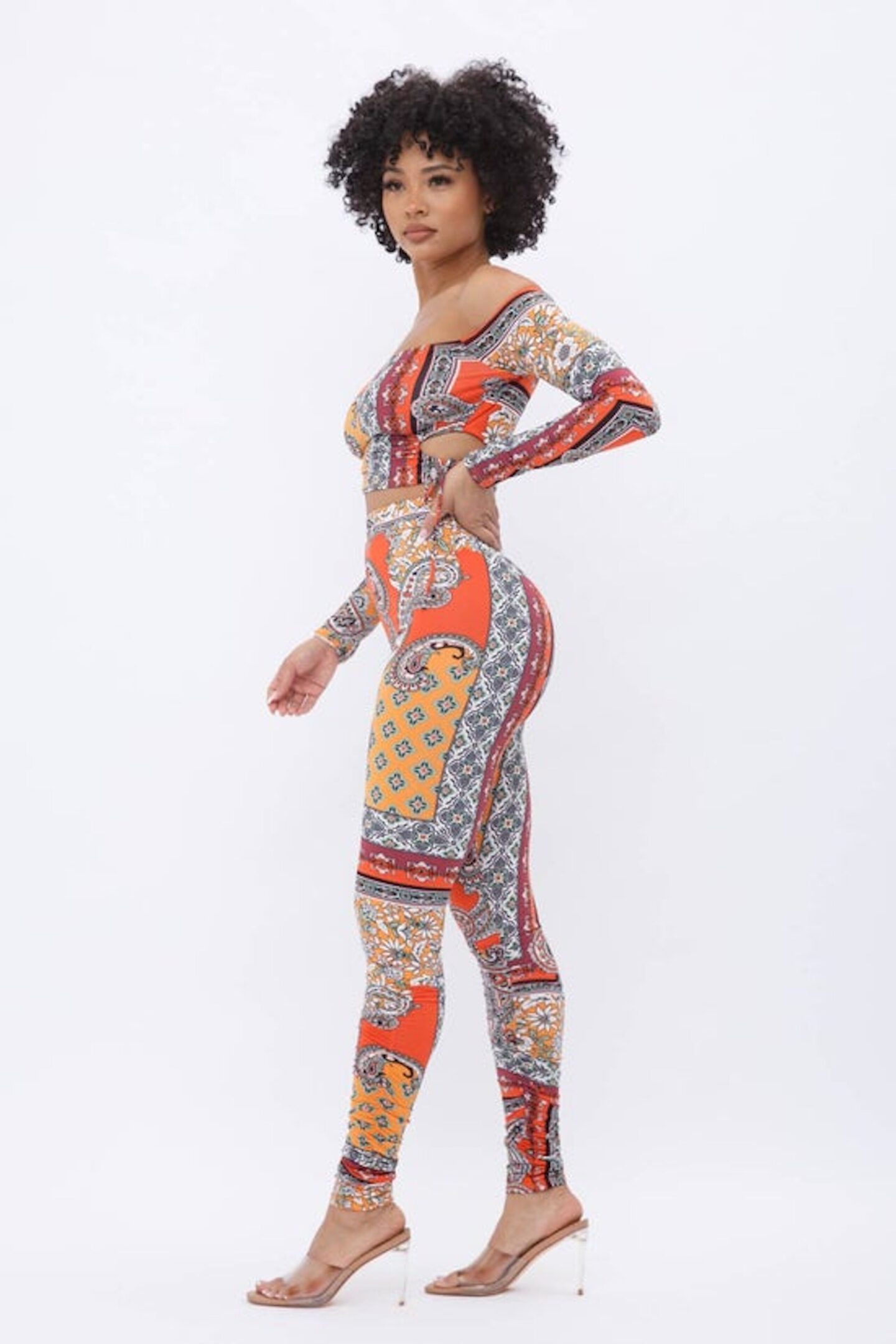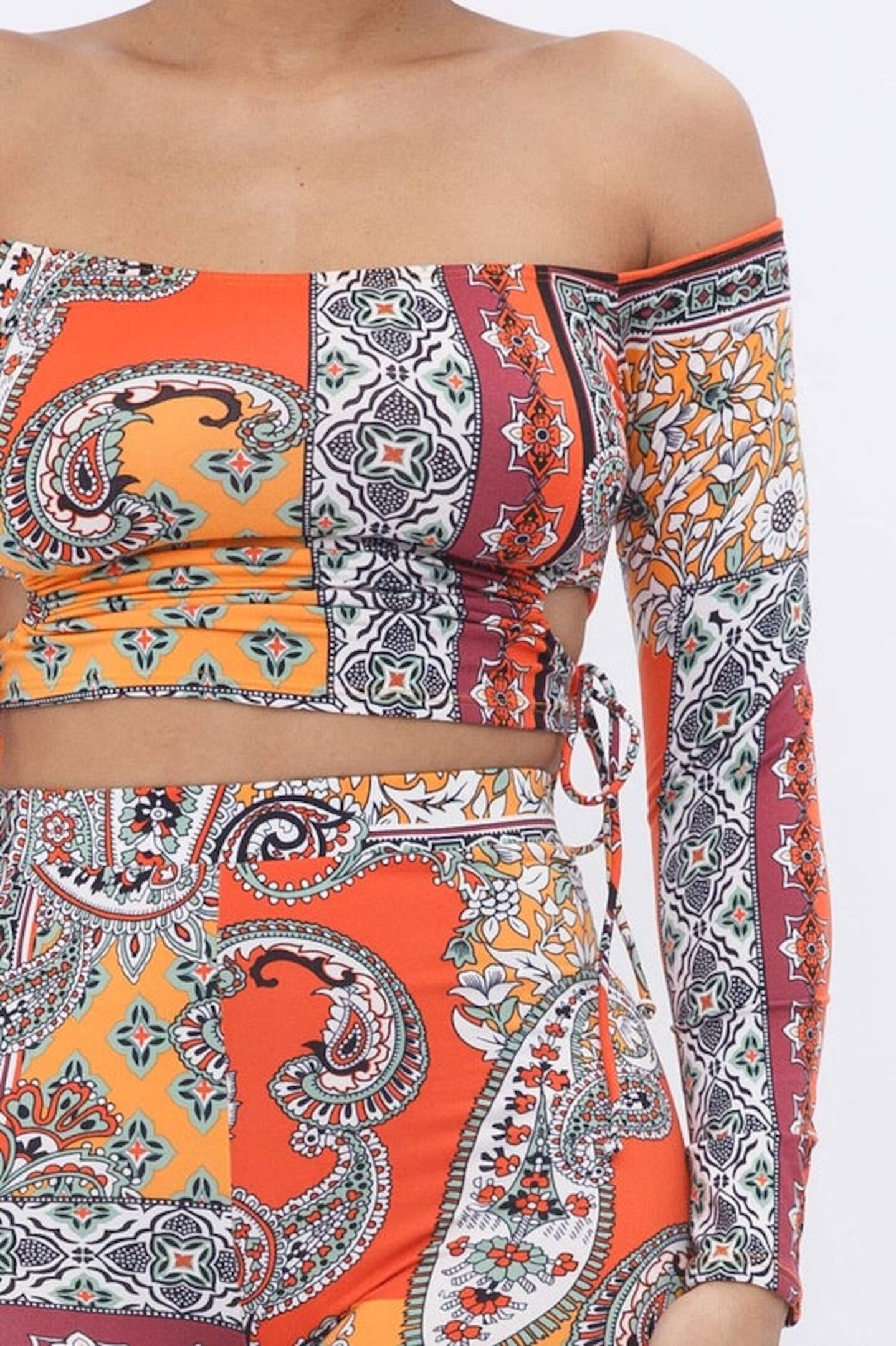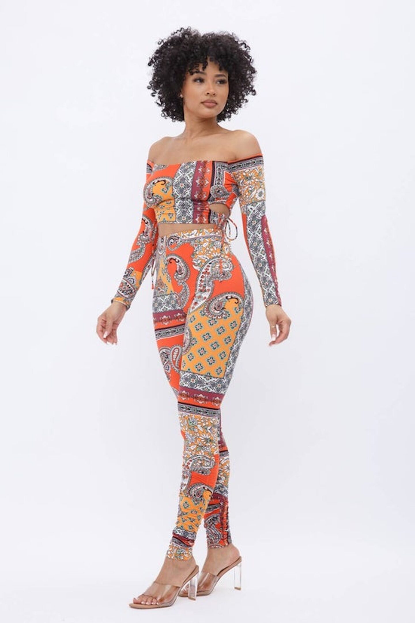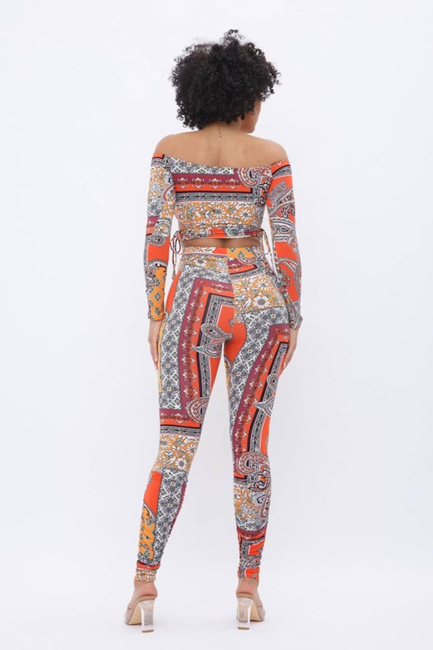 Brushed Dty Print Off Shoulder Open Side Tie Long Sleeve Crop Top and Leggings Set