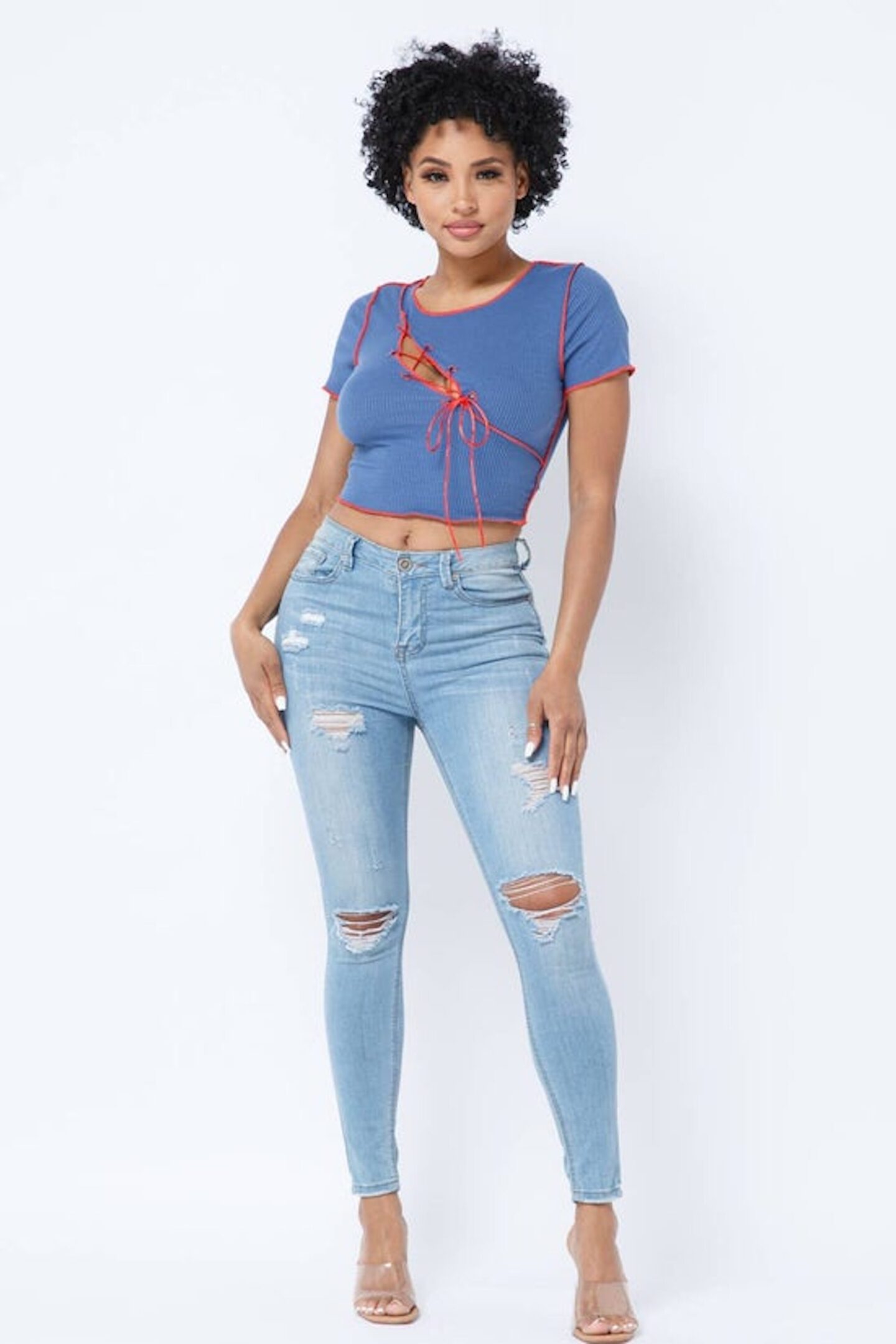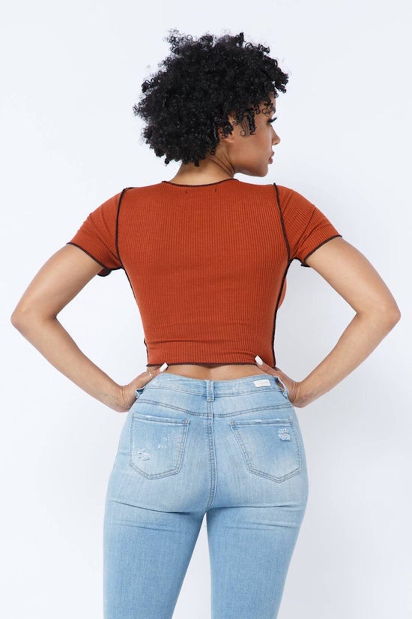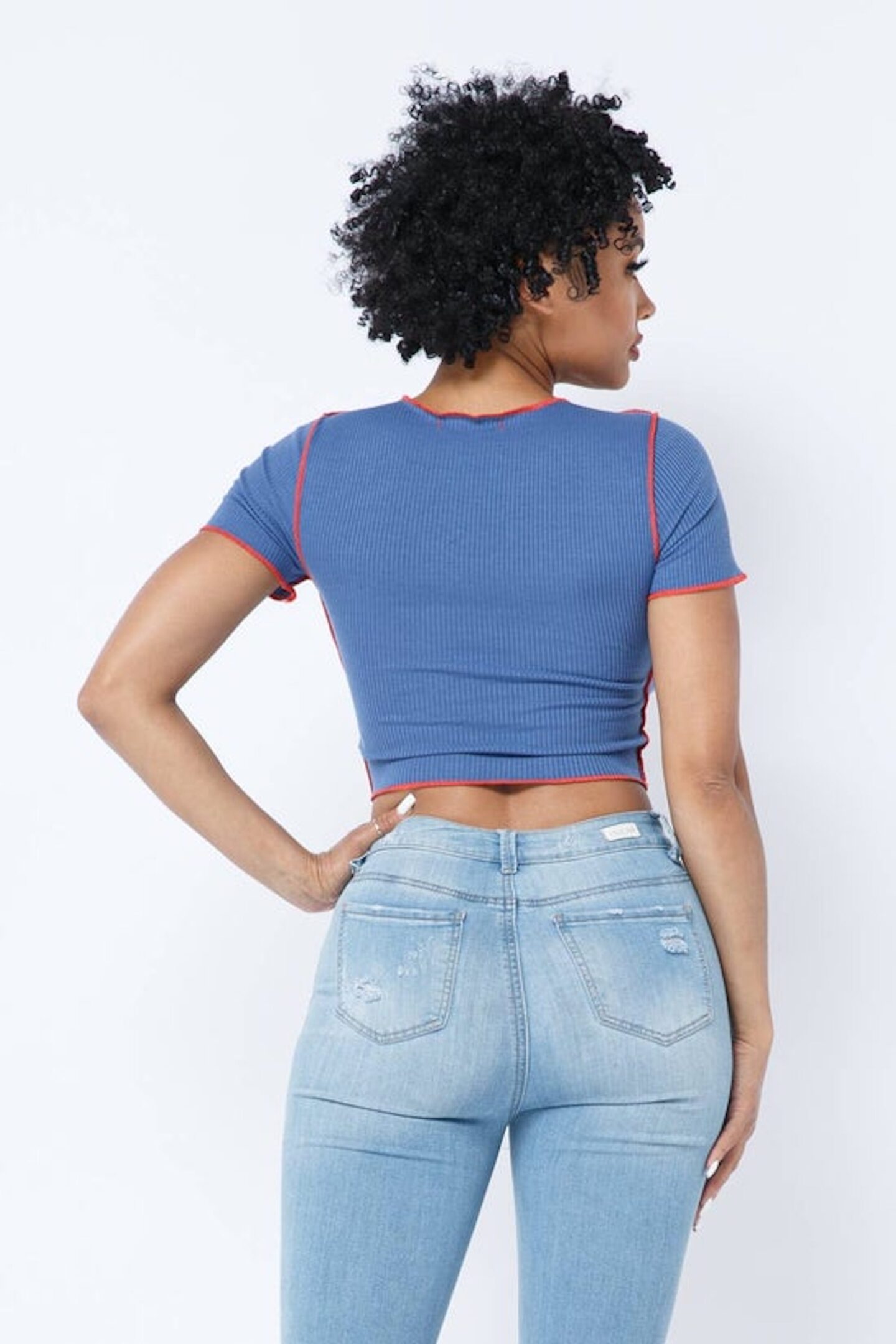 4×2 Rib Contrast Overlock Outstitch Detail Open Front Cut Out Tie Crop Top