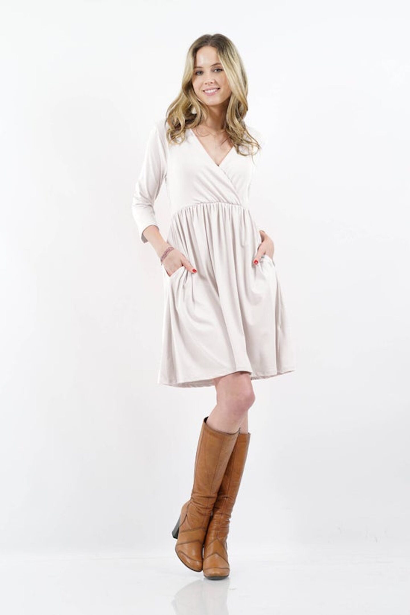 SI-15612 3/4 SLEEVE Empire Surplice Shirred TWO-POCKET TUNIC Breeze through your days in flowing comfort with this soft surplice dress that features side pockets for added convenience. – Size S: 36” long from high point of shoulder to hem – Model (wearing size S): 5′ 7” tall; 32” chest; 25” waist; 35” hips – 92% brushed polyester / 8% spandex – Machine wash – Imported Material: 92% Brushed POLYESTER, 8% SPANDEX